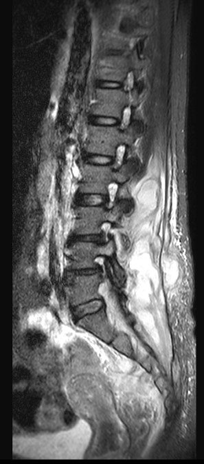 • Komplikace – absces v paravertebrálních tkáních, epidurálním prostoru nebo psoas svalu, což může vést k dalším symptomům jako bolest v břiše nebo nohách. Epidurální abscesy mohou vést k inkontinenci nebo poškození míchy (myelopatie)