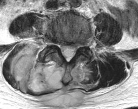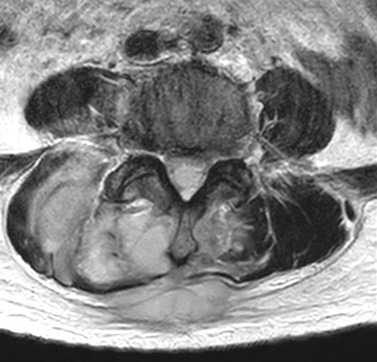 Rozsáhlý absces paravertebrálních svalů páteře zasahující do páteřního kanálu v bederní oblasti.